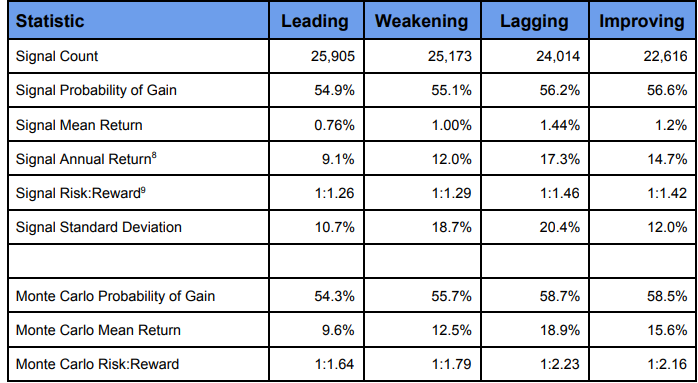 Immediately we can see that historically, equities entering the Lagging quadrant—where they have negative relative trend—have the highest returns.